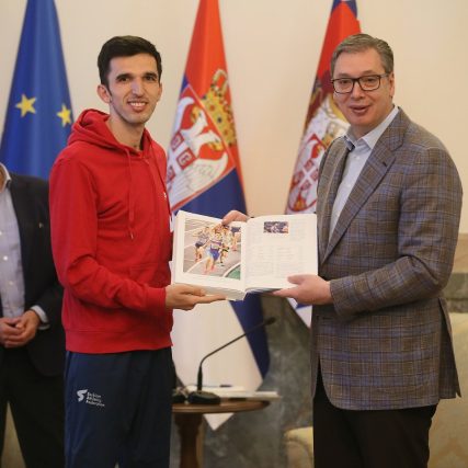 Na prijemu u Predsedništvu Srbije, reprezentativac naše zemlje Elzan Bibić uručio je predsedniku Vučiću prvi primerak tek odštampane knjige Stevana Kovačevića ATLETSKI DRAGULJI SRBIJE 2.