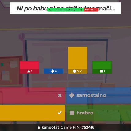 I pored poteškoća zbog kašljucanja tehnike na samom početku susreta, uspeli smo ponovo da održimo zajednički čas, 27. maja 2024. godine. Ovog puta bavili smo se zanimljivim jezičkim temama, kao što su: spunerizam, frazeologizmi, najčešće poruke iz detinjstva, najmoćnije reči srpskog jezika. Takođe smo odigrali i jedan Kahut kviz.