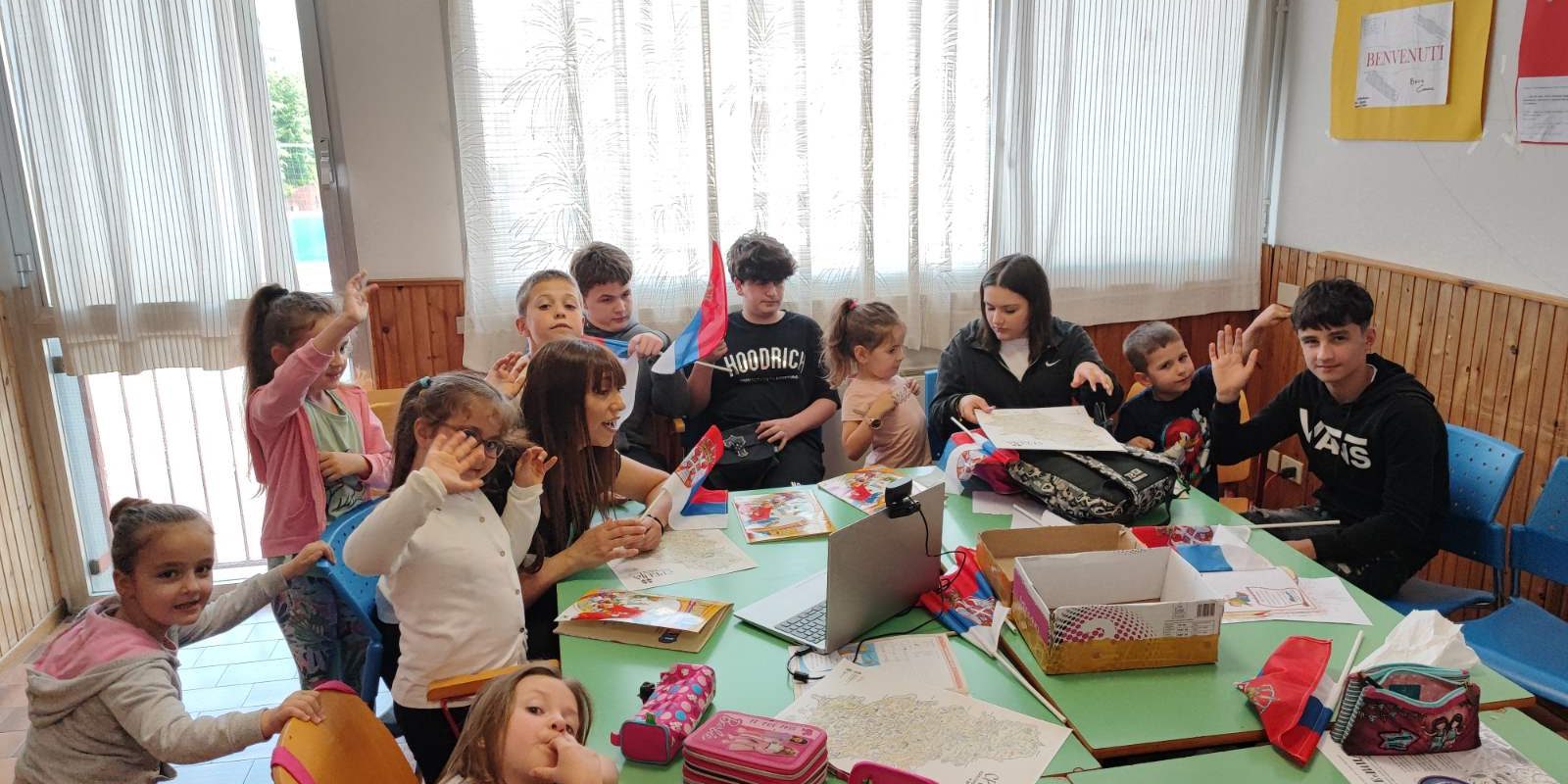 Učenici i nastavnica iz Italije su se javili iz svoje učionice u Busolengu, dok su učenici iz Srbije ovoga puta ostali kod svojih kuća u selima ravnice Stiga i preko svojih uređaja pristupili susretu.